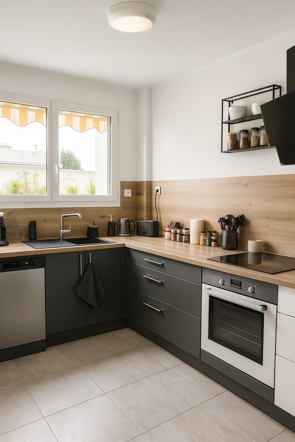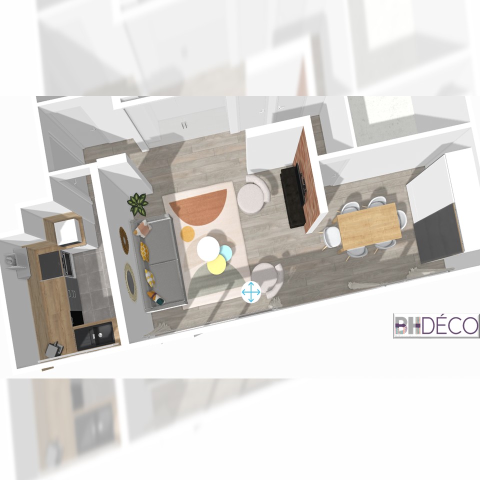 - Le vrai + BH-déco, la cuisine, aprés beaucoup de travail et de modifications de la demande, nous avons décidé de conserver les meubles bas, de rajouter un meuble dans l’angle pour poser un four. Nous avons ajouter une hotte mais plus de meubles hauts.