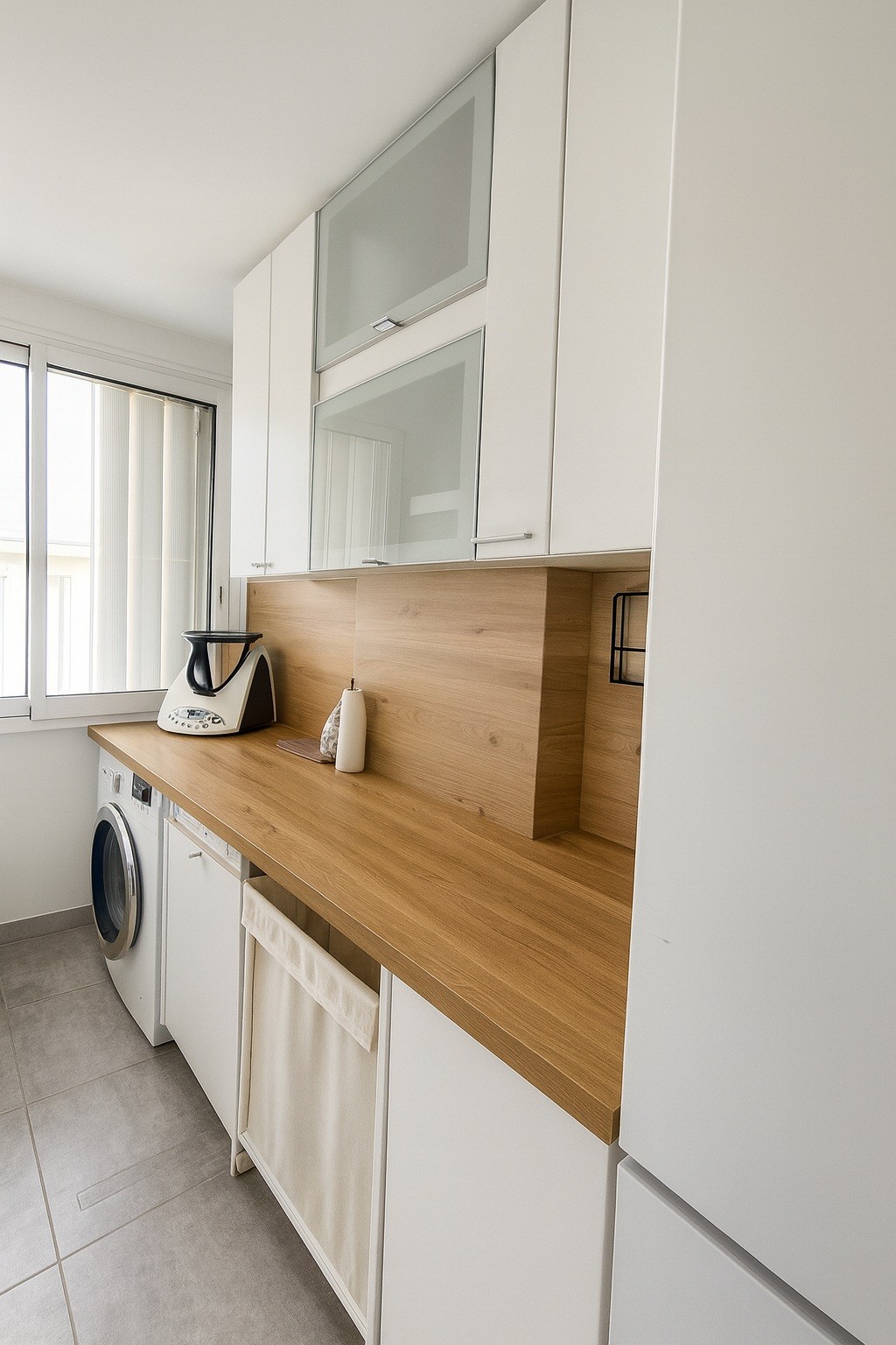 - La seconde cloison déposée l’a été dans la buanderie qui du coup est devenue immense et a une véritable utilité dans cet appartement.