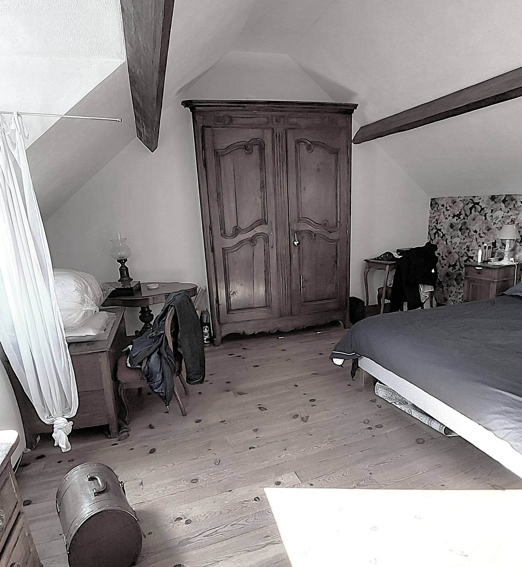 - L’idée, rattraper le mur qui n’est pas droit et intégrer totalement le dressing dans la pièce.