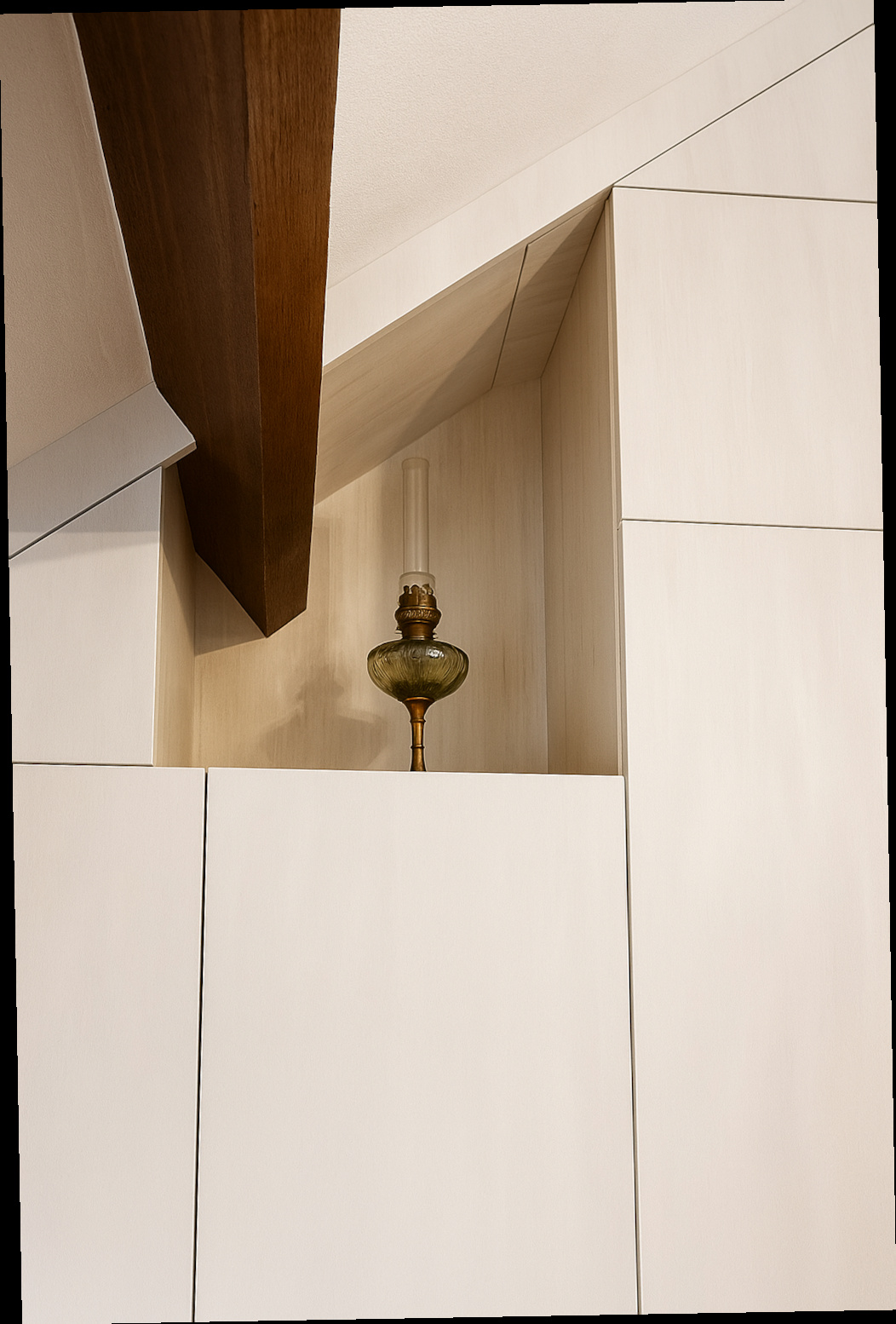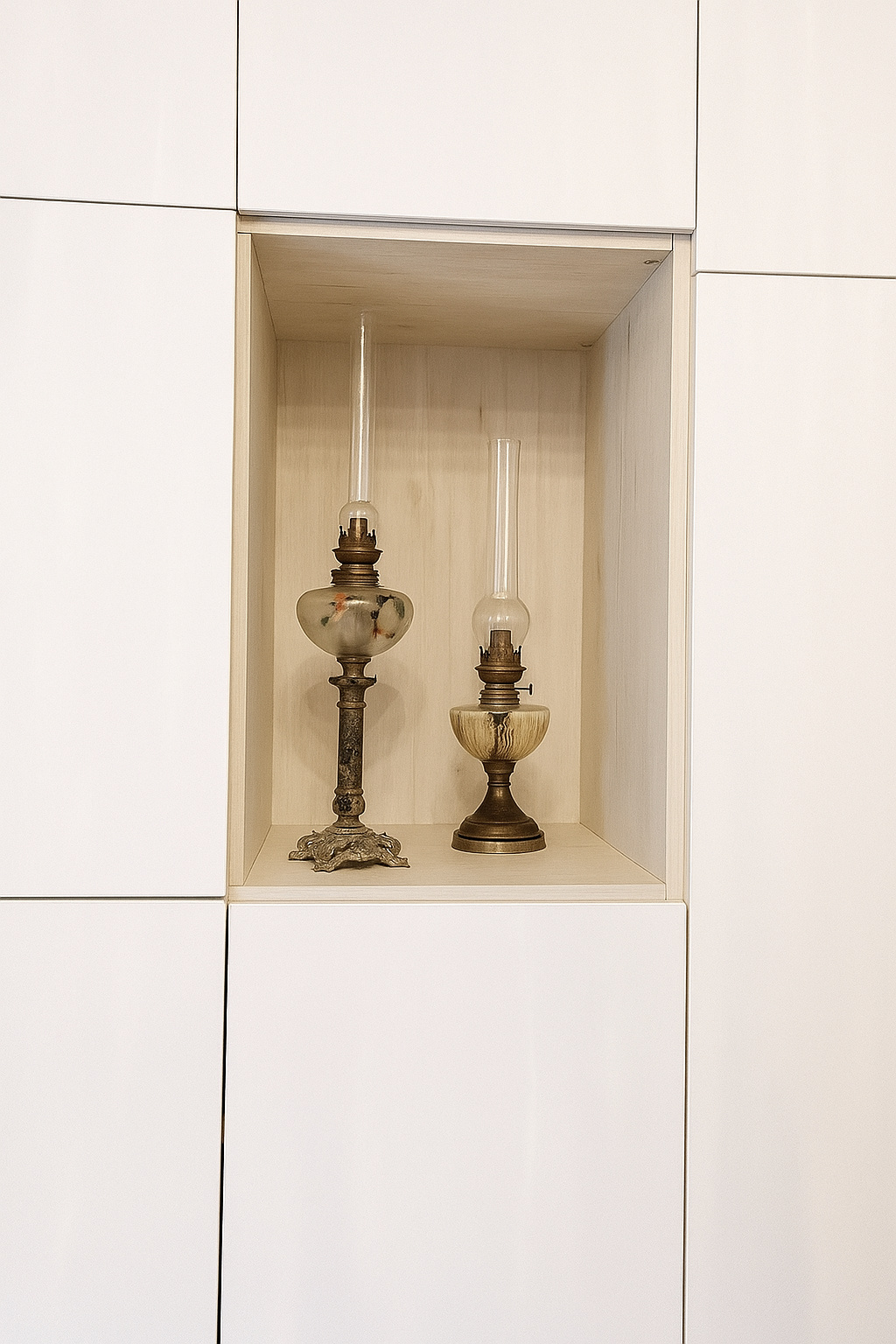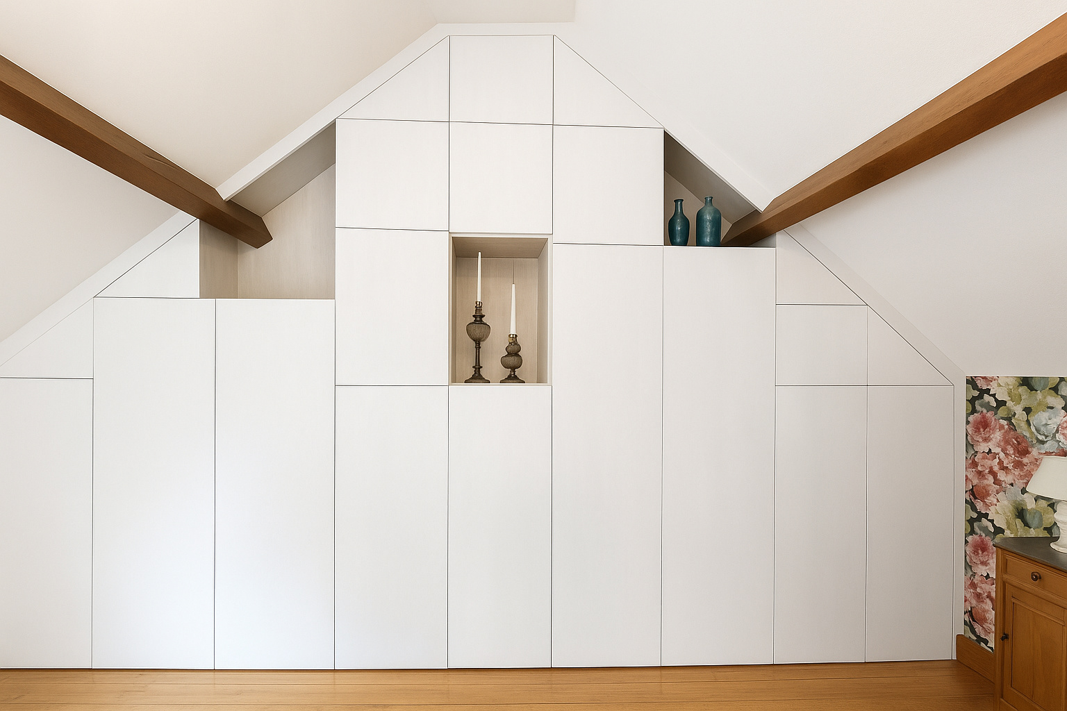 - des niches en bois clair pour conserver la profondeur de la pièce