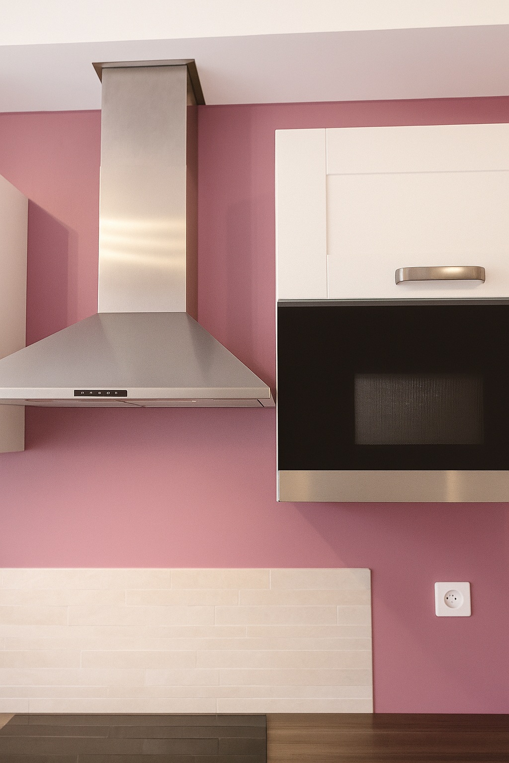 - La couleur rose assez spécifique n’a été posée que derrière les meubles et en hauteur des murs pour ne pas prendre trop de place