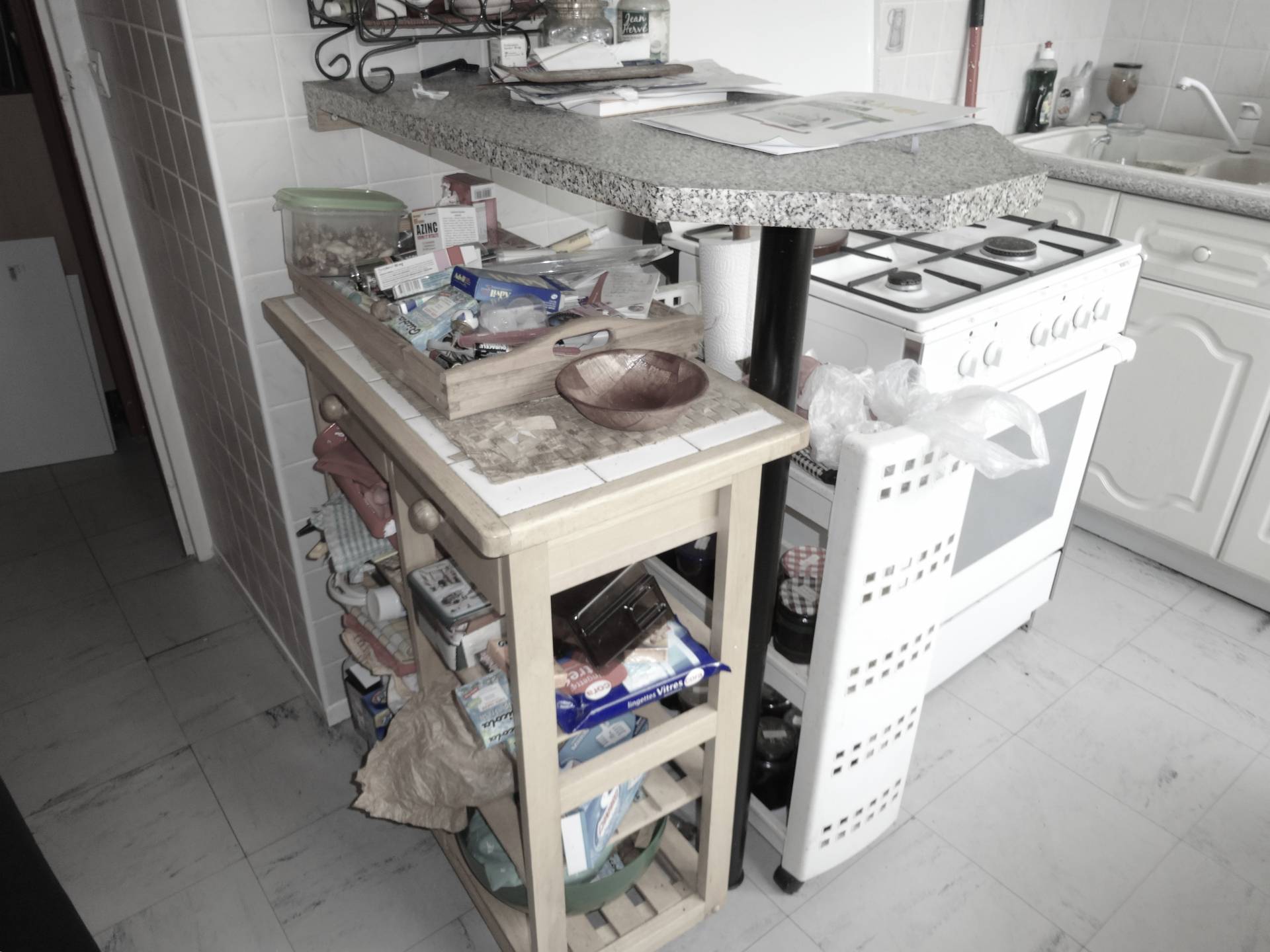 Les meubles et l’espace de travail étaient concentrés sur un seul mur au fond de la cuisine donc pas assez de rangement. L’espace de cuisson ? Une énorme cuisinière en pose libre qui gênait l’accès à l’évier. Une table bar inaccessible et tout l’espace cuisine concentré sur la moitié de la pièce.