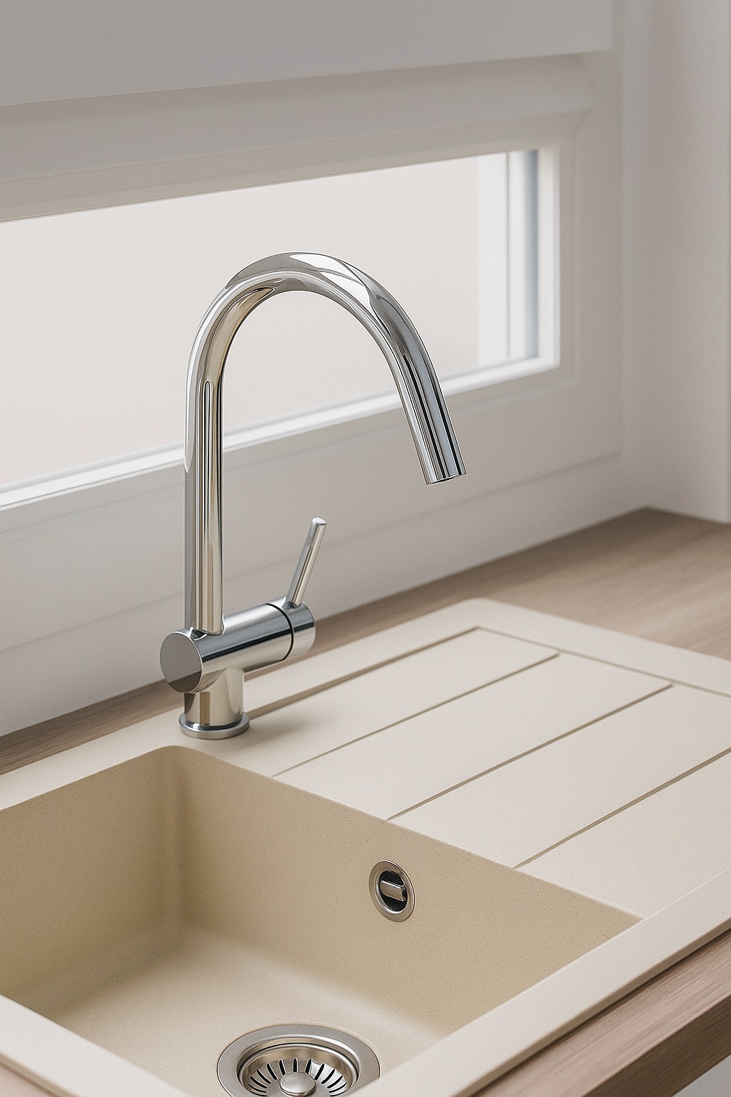 - Il a suffit de déplacer les arrivées et évacuation d’eau pour déplacer l’évier et créer une nouvelle ligne de rangements sur la totalité du mur coté fenêtre.